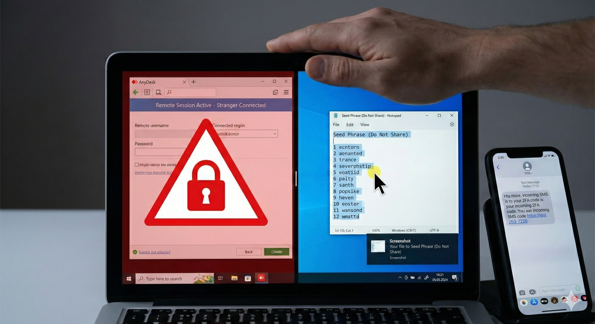 Seriöse Support-Mitarbeiter oder Krypto-Exchanges werden dich nie bitten, eine Fernwartungssoftware zu installieren oder nach deiner Seed Phrase fragen. Wenn "Marc" oder "Anna" danach fragen: Sofort blockieren.